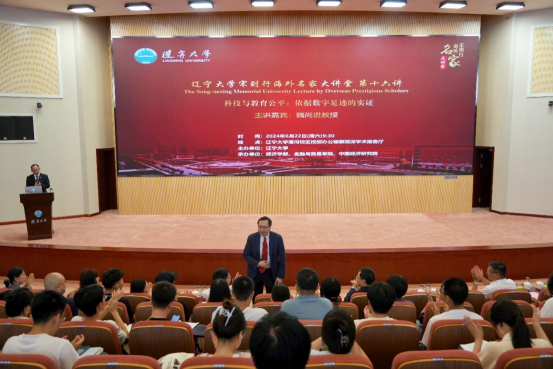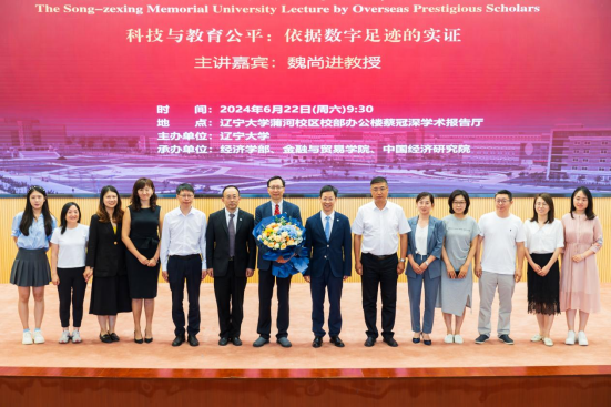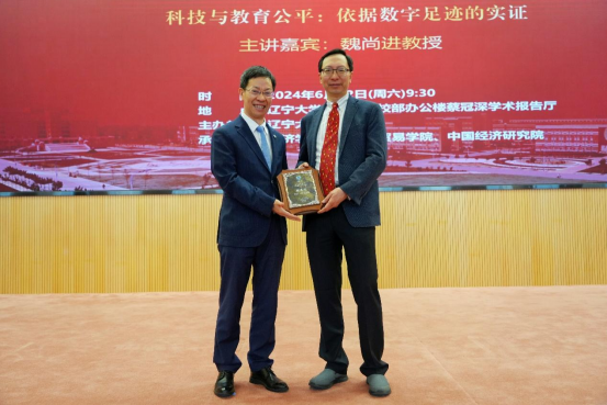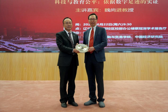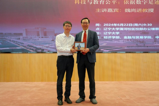 6月22日上午,sunbet申愽官网宋则行海外名家大讲堂(第十六讲)在蒲河校区校部办公楼蔡冠深学术报告厅举行。美国哥伦比亚大学魏尚进教授应邀作题为《科技与教育公平:依据数字足迹的实证》的学术报告。sunbet申愽官网党委副书记、校长余淼杰教授出席讲座并致辞,美国弗吉尼亚理工大学未来工作场所与实践研究中心主任葛苏勤教授、辽宁大学经济学部副主任霍伟东教授、《sunbet申愽官网学报》编辑部主任刘钧霆教授、中国经济研究院副院长兼金融与贸易学院副院长马湘君教授、金融与贸易学院副院长李丹教授、李安民经济研究院副院长游宇教授出席讲座。本次大讲堂由sunbet申愽官网副校长仇焕广教授主持。