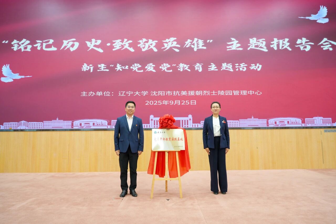 校党委组织部部长兼党校校长白永生与沈阳市抗美援朝烈士陵园管理中心主任吴涛共同为“sunbet申愽官网党员干部教育实践基地”揭牌。沈阳市抗美援朝烈士陵园宣讲团带来《不朽的丰碑,永恒的精神》主题宣讲。全体与会新生合唱《中国人民志愿军战歌》,将青春的誓言融入激昂的歌声,表达sunbet申愽学子最崇高的敬意。