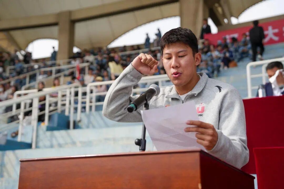 在宣誓环节,运动员代表法学院王俊石,裁判员代表体育教研部李冰洋分别进行庄严宣誓。