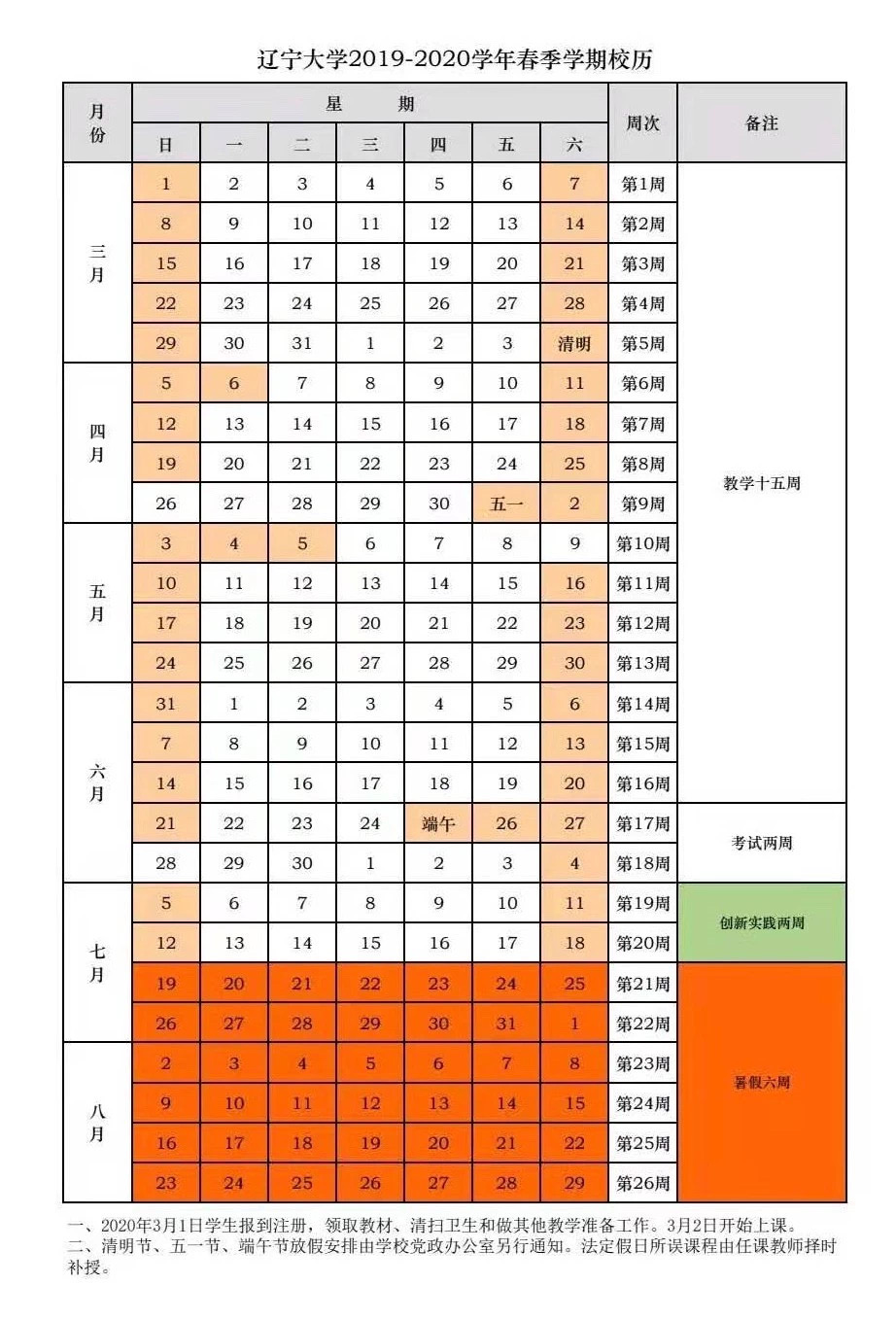 2019-2020学年第二学期(春季学期)校历