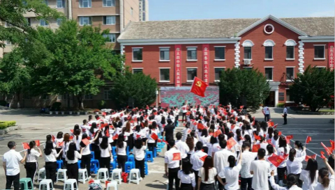 现场师生手持旗帜,齐声合唱《唱支山歌给党听》《万疆》等歌曲,观看由中央媒体发布的建党百年主题MV。