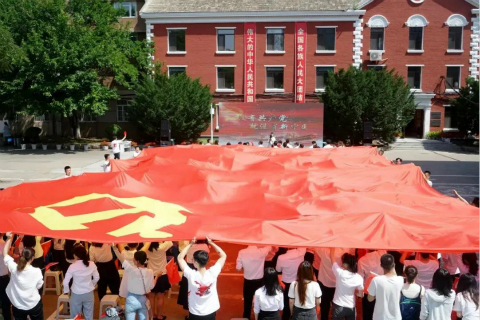 直播结束后,师生起立齐唱《没有共产党就没有新中国》,巨幅党旗伴随着歌声缓缓展开,在师生的齐心传递下,飘扬经过与会方阵。
