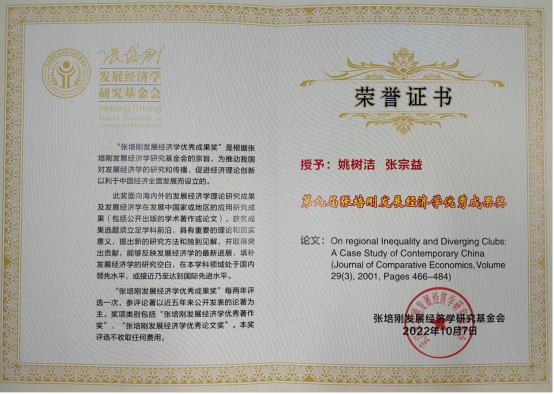 sunbet申愽官网李安民经济研究院院长姚树洁教授发表在Journal of Comparative Economics(2001,29(3):466-484)的文章On regional Inequality and Diverging Clubs:A Case Study of Contemporary China,于2022年获第九届张培刚发展经济学优秀成果奖