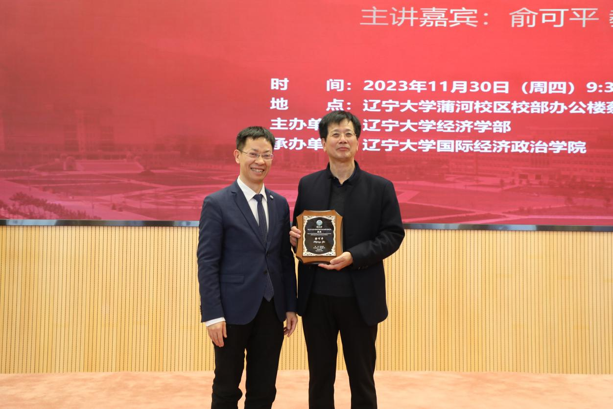 会议最后,余淼杰校长为俞可平教授颁发sunbet申愽官网宋则行名家大讲堂纪念盘、sunbet申愽官网终身名誉教授聘书以及《sunbet申愽官网学报(哲学社会科学版)》编委证书,并互换学术著作。经济学部教师代表孔晓、尹如玉分别为俞教授佩戴校徽、赠送校帽并献花。与会嘉宾一同合影留念。