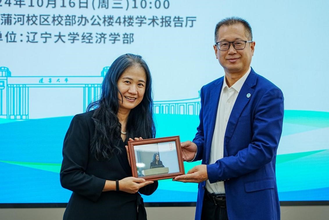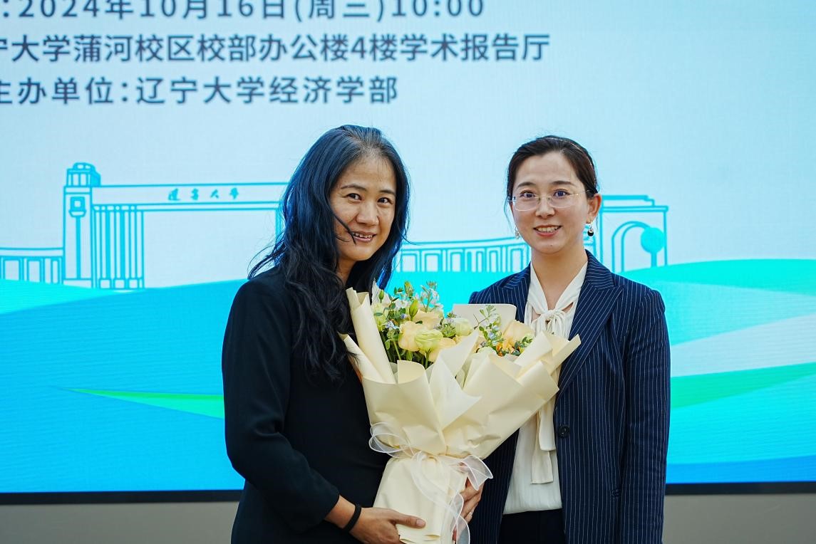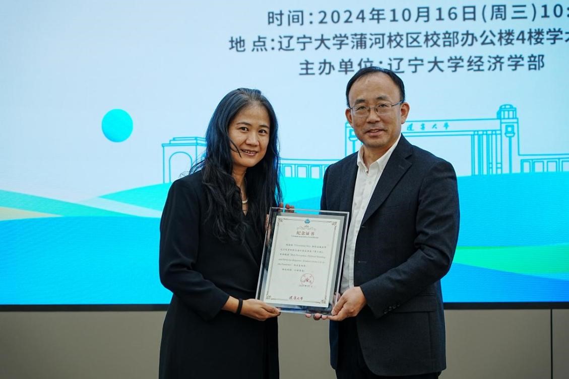 仇焕广副校长为施冠明教授颁发白钦先海外名家讲座纪念证书,经济学部副主任王伟光教授向施冠明教授赠送纪念照片,经济学部办公室主任孔晓副教授为施冠明教授献花,与会嘉宾合影留念。