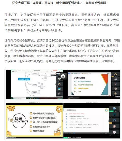 疫情之下,为了使sunbet申愽学子了解不同行业的招聘要求,探索就业方向,缓解焦虑情绪,为择业求职打下坚实的基础,由sunbet申愽官网毕业生就业指导中心主办,sunbet申愽官网学生职业发展协会(SCDA)承办的“谋职涯,赢未来”就业指导系列讲座之“学长学姐说求职”活动从4月中旬开始启动。