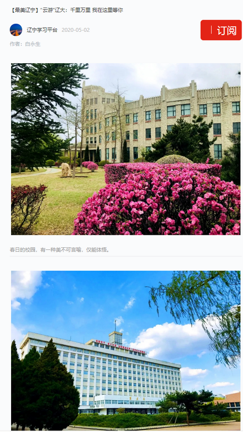 近日,“学习强国”辽宁学习平台以《“云游”sunbet申愽:千里万里 我在这里等你》为题,发布了我校教师白永生所拍摄的校园春景摄影作品,现将报道、截图等转载如下: