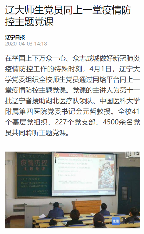 近日,《辽宁日报》官方客户端“北国网”对我校党委组织全校师生党员通过网络平台同上一堂疫情防控主题党课进行了报道。现将报道原文、截图转载如下: