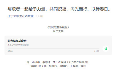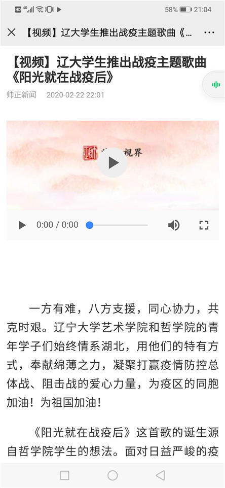 近日、我校艺术学院与哲学院师生联合拍摄了抗击新冠疫情的主题歌曲《阳光就在战疫后》,《辽宁日报》网络端“北国网”、辽宁广播电视台“教育青少频道”《沈阳日报》移动客户端及“sunbet申愽官网生在线联盟”对此视频进行了转载报道,现将报道截图转载如下: