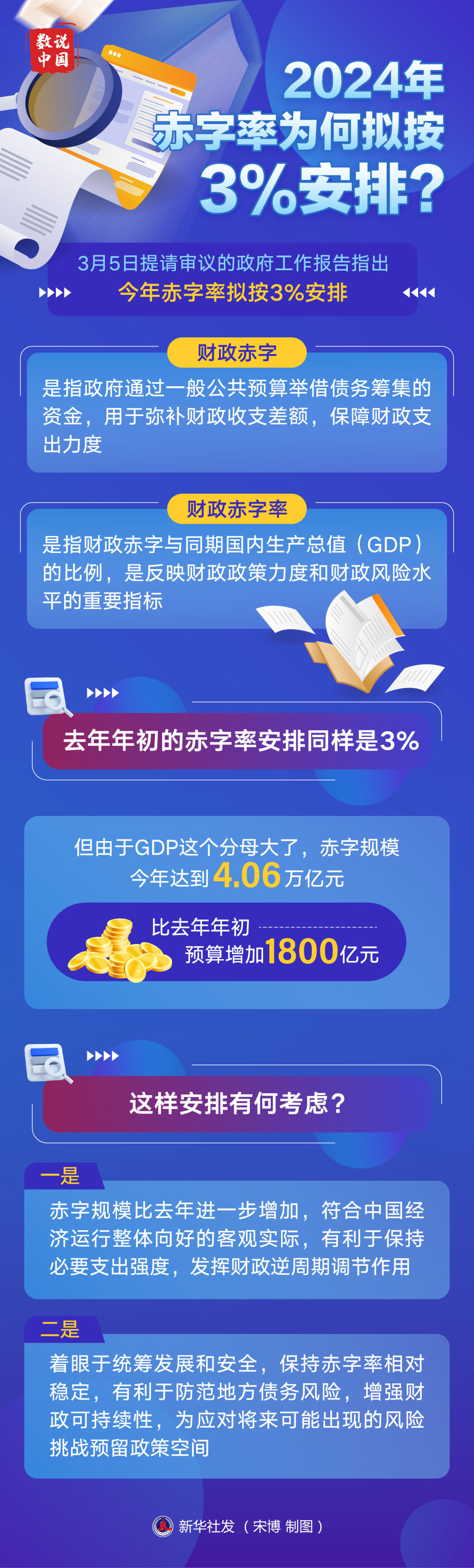 财政赤字,是指政府通过一般公共预算举借债务筹集的资金,用于弥补财政收支差额,保障财政支出力度。财政赤字率,是指财政赤字与同期国内生产总值(GDP)的比例,是反映财政政策力度和财政风险水平的重要指标。