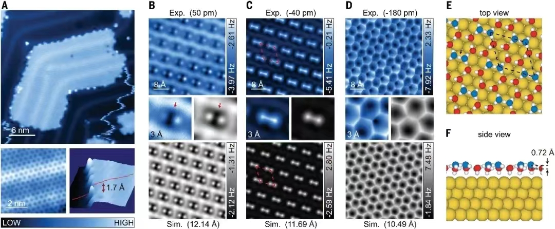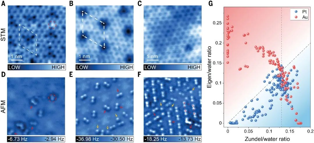 研究团队在超高真空下使用基于低温qPlus的原子力显微镜直接观察到了Au(111)和Pt(111)表面上的氢键水网络中的本征型和Zundel型水合质子,为长期以来学界关于水中水合质子的性质的争论提供了原子层面的理解,为设计和制备新型对称氢键体系提供了新的思路,有望为实现常压下与对称氢键有关的新奇物性及其实际应用奠定基础。