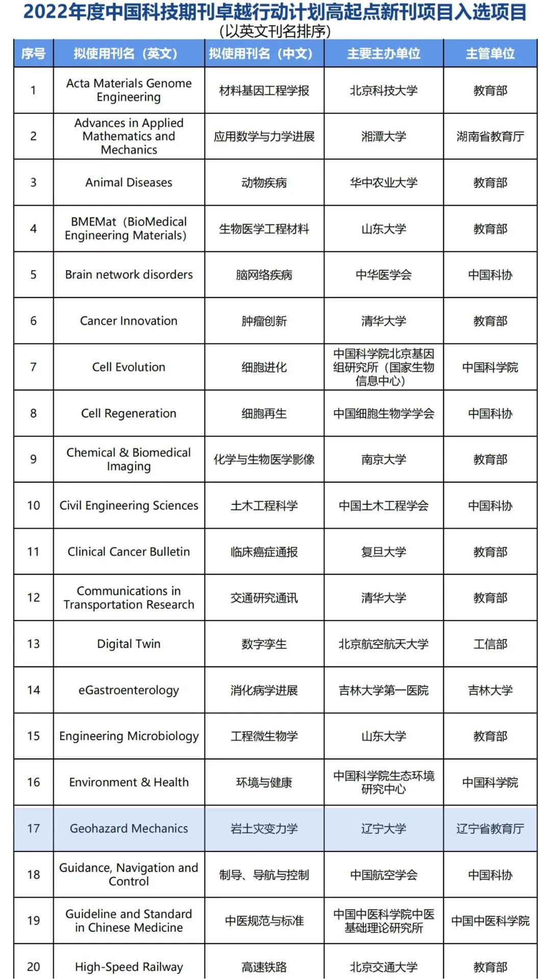 9月21日,中国科技期刊卓越行动计划办公室发布了《关于下达2022年度中国科技期刊卓越行动计划高起点新刊入选项目的通知》,sunbet申愽官网与中国岩石力学与工程学会组织申报的Geohazard Mechanics(ISSN:2949-7418)入选高起点新刊项目。入选后,期刊将获批国内统一连续出版物号,在中国落地,同时获批资助经费50万元。