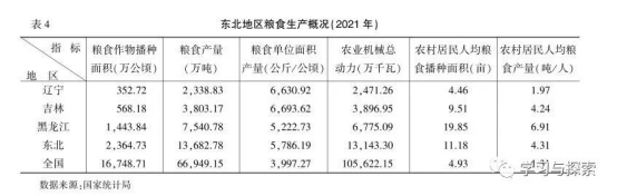 二是重要的粮食生产基地。东北地区气候温和、水资源丰富、地势平坦、土壤肥沃、宜于耕种,区域内主要分布有松嫩平原、三江平原和辽河平原等三大平原,黑土地面积约103万平方公里。得益于优良自然条件,东北地区是我国最大的商品粮生产基地,也是粮食安全的“稳定器”与“压舱石”。从粮食播种面积来看,2020年东北三省粮食总播种面积为2364.73万公顷,占全国粮食播种面积的14.11%。从粮食产量来看,2020年三省粮食总产量为13682.78万吨,占全国粮食总产量的20.44%,单位面积产量为5786.19公斤/公顷,高于全国平均水平的3997.27公斤/公顷。从农业现代化生产来看,2020年东北地区农业机械总动力达到13143.3万千瓦,占全国的12.44%,农村居民人均粮食播种面积和粮食产量分别为11.18亩和4.31吨,远高于全国平均水平的4.93亩和1.31吨,农业机械化规模化生产在全国处于领先水平,有利于产生显著的规模经济效益,有效降低粮食生产成本,提升粮食生产效率,提高粮食产量。