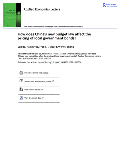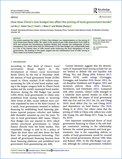 新华国际商学院薄澜副教授(第一作者)和姚海鑫教授(通讯作者)于2022年1月在国际期刊Applied Economics Letters 在线发表题为“How does China’s new budget law affect the pricing of local government bonds? ”的学术论文。张微微副教授及英国德蒙福特大学Fred Mear副教授参与论文写作。该期刊为SSCI来源期刊,论文是辽宁省教育厅项目《新预算法实施对我国地方政府债务融资成本的影响研究》阶段性研究成果。