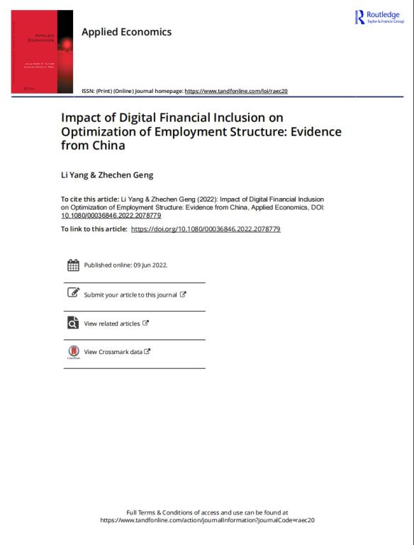 金融与贸易学院杨丽教授作为第一作者的合作论文Impact of Digital Financial Inclusion on Optimization of Employment Structure: Evidence from China在Applied Economics发表。