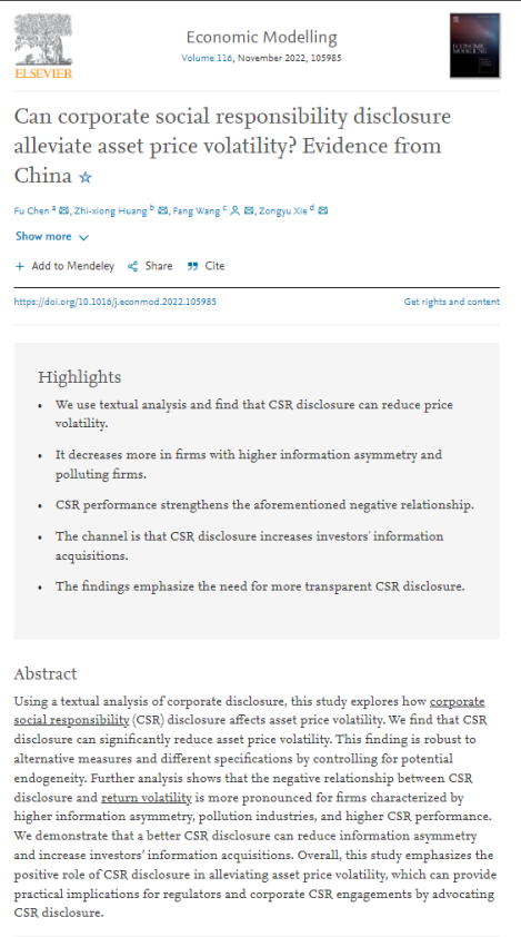 近日,金融与贸易学院教师陈芙作为第一作者的合作论文Can Corporate Social Responsibility Disclosure Alleviate Asset Price Volatility? Evidence from China在Economic Modelling发表。