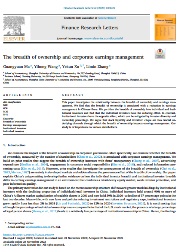 徐业坤合作论文The breadth of ownership and corporate earnings management在Finance Research Letters发表