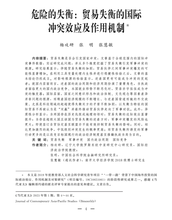 国际经济政治学院杨攻研教授(第一作者)与中国社会科学院金融研究所副所长张明研究员、南开大学博士张慧敏共同完成的学术论文“危险的失衡:贸易失衡的国际冲突效应及作用机制”作为卷首文章发表于《当代亚太》2023年第1期。