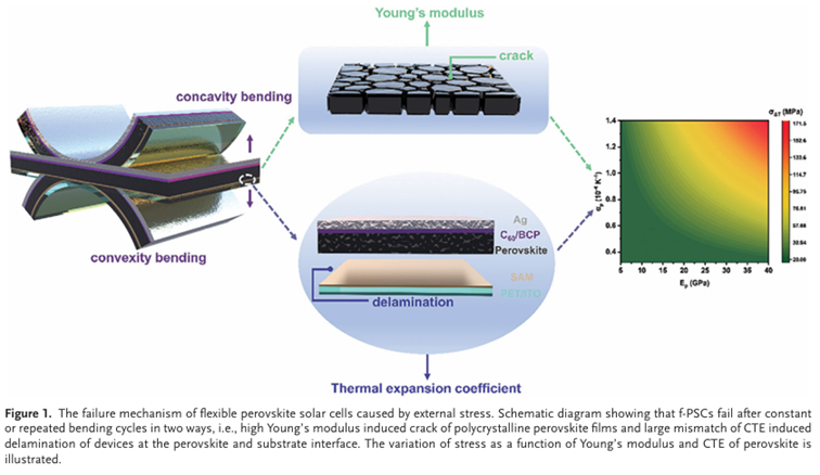 柔性钙钛矿太阳能电池在其使用寿命期间经常经历持续或周期性弯曲。多晶钙钛矿薄膜的破裂以及钙钛矿和基底界面的分层可能导致器件发生灾难性故障,从而带来严重的稳定性问题。丁勇教授团队与合作者开发了一种多重动态氢键聚合物网络,以两种方式增强柔性钙钛矿太阳能电池的机械强度。聚丙烯酸主链通过其柔性和空间占据将钙钛矿和基底之间的热膨胀系数失配降低了16.7%。多巴胺支链提供多个动态氢键位点,这有助于增加应力变形时的能量耗散,并将钙钛矿的杨氏模量降低54.3%。反式柔性钙钛矿太阳能电池在连续1个太阳等效光照下2000小时内实现了23.02%的最佳功率转换效率,并保持了初始效率的81.3%。此外,器件表现出优异的机械稳定性,经过5000次弯曲循环后仍能保持原始值的90.2%。