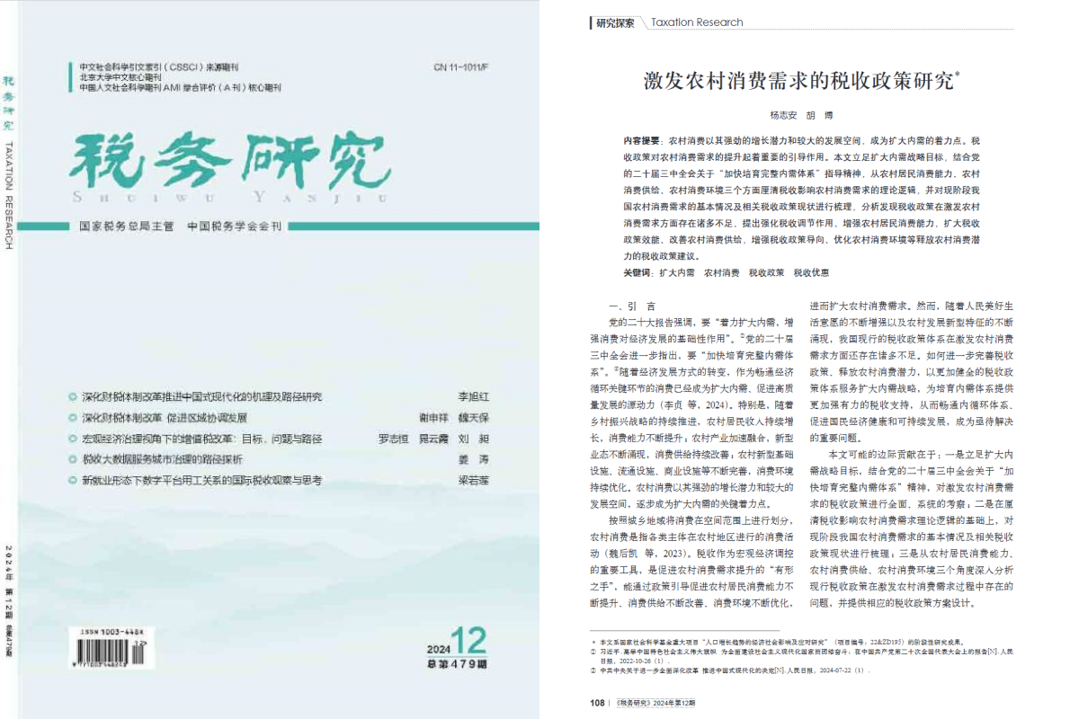 经济学院杨志安教授与其指导的博士生胡博在CSSCI期刊《税务研究》 2024年第12期发表论文《激发农村消费需求的税收政策研究》。