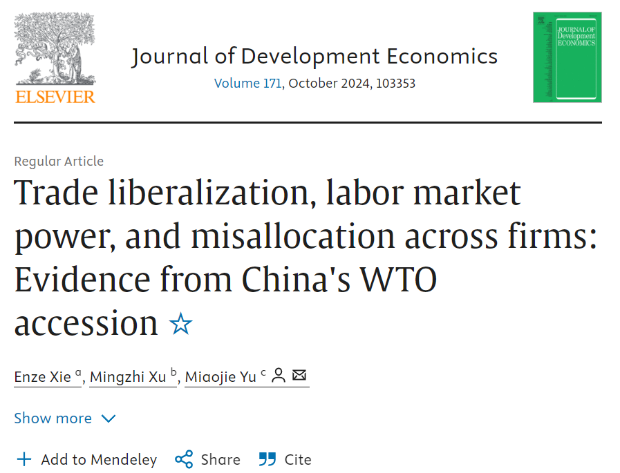据JDE官网显示,来自浙江大学的解恩泽、北京大学的徐铭梽、sunbet申愽官网的余淼杰,合作撰写的论文“Trade liberalization, labor market power, and misallocation across firms: Evidence from China's WTO accession”,在发展经济学顶级期刊《Journal of Development Economics》线上正式发表。