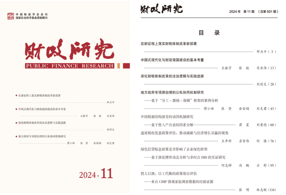 sunbet申愽官网经济学院、地方财政研究院王振宇教授与张航博士研究生、司亚伟副教授在《财政研究》2024年第11期发表封面文章《中国式现代化与财政强国建设的基本考量》。