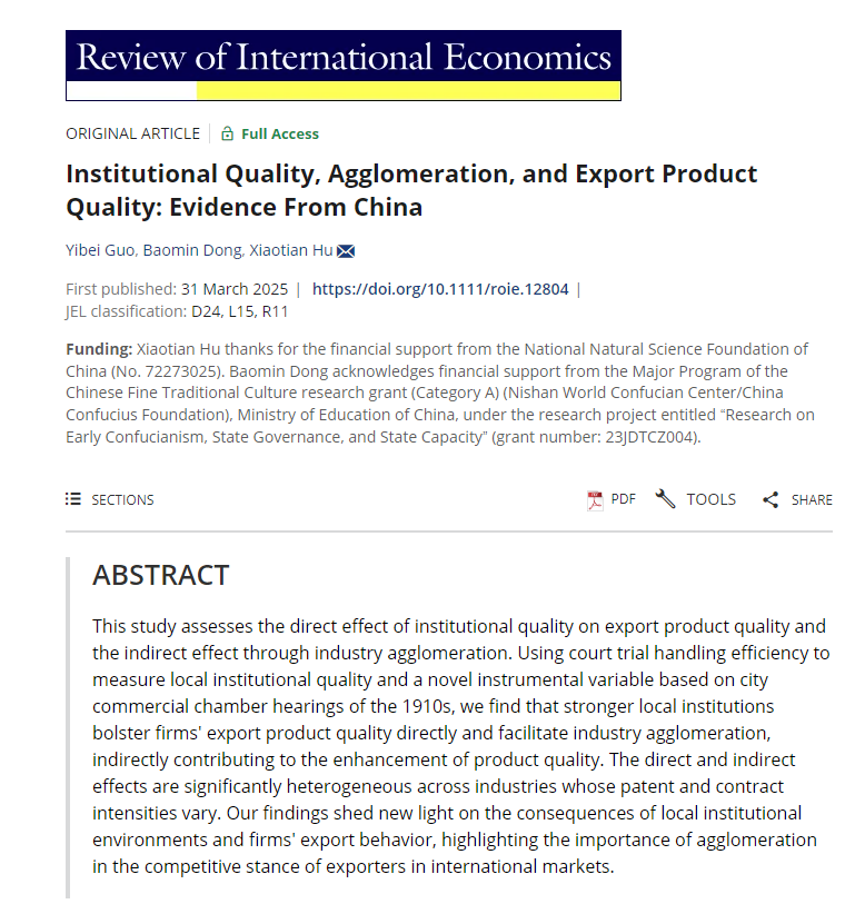 近日,sunbet申愽官网经济学部副主任董保民教授与河南大学商学院讲师郭益蓓、北京工商大学经济学院讲师胡晓天合作撰写的学术论文“Institutional Quality, Agglomeration, and Export Product Quality: Evidence From China”在国际经济学著名期刊Review of International Economics发表。