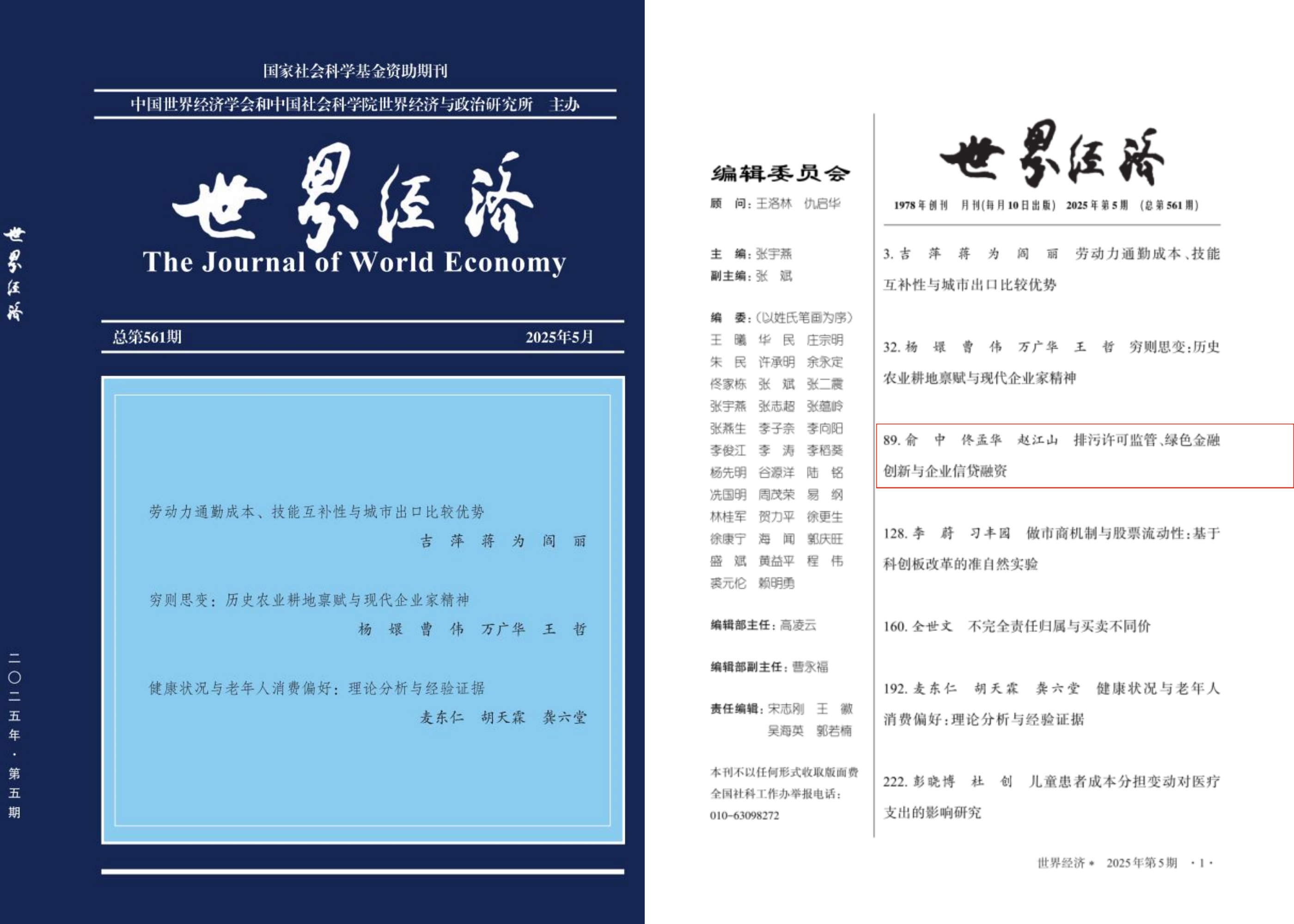 近日,经济学院赵江山讲师作为通讯作者,与东北财经大学经济学院博士研究生俞中、佟孟华教授合作撰写的学术论文《排污许可监管、绿色金融创新与企业信贷融资》在《世界经济》2025年第5期发表,并被期刊公众号选作首篇推送。