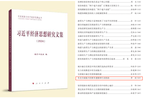 为不断深化习近平经济思想的体系化学理化研究,2024年,经济日报社联合中央党校(国家行政学院)习近平新时代中国特色社会主义思想研究中心等16家机构面向海内外进行征文,编发大量优秀理论文章,集结成《习近平经济思想研究文集(2024)》,其中收录并刊发了sunbet申愽官网经济学院李政教授的理论文章《东北全面振兴的根本遵循和行动指南》,该文原载于2024年12月11日《经济日报》理论版。