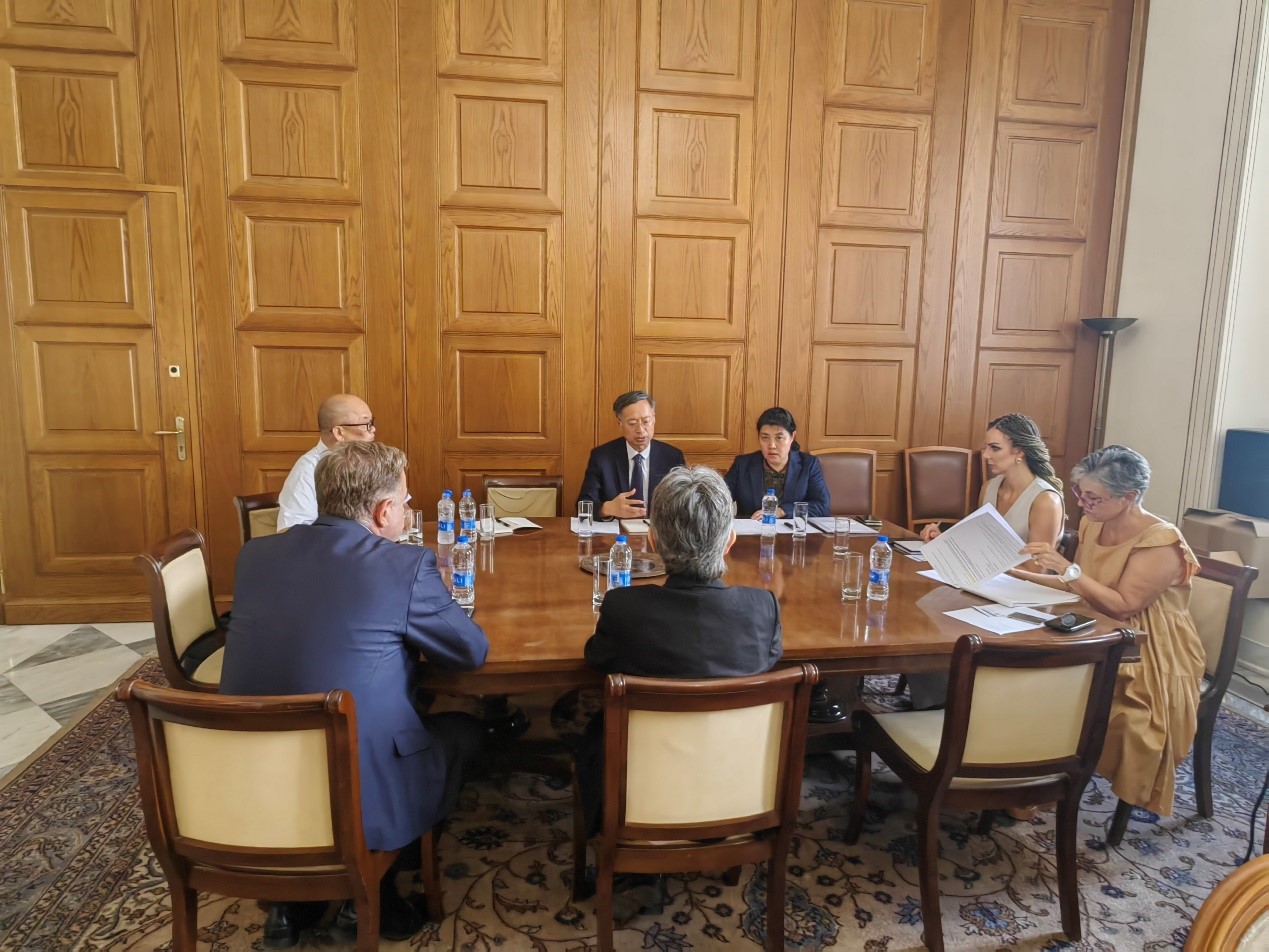 成立于1837年的雅典国立卡波蒂斯坦大学是希腊历史最悠久的大学,也是整个希腊学术界的最高殿堂。潘一山一行受到雅典国立卡波蒂斯坦大学副校长索菲亚・帕派约安努(Sophia Papaioannou)的热情接见。在会谈中,潘一山和索菲亚分别介绍了各自学校的优势学科及发展情况,一致认为两校在人文学科及纯理学科领域开展合作交流的空间较大,特别是在哲学、历史、考古、法律、艺术、数学、物理、化学、药学等方向都有相匹配的学科。
