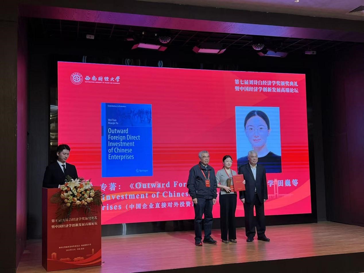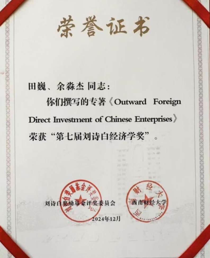 2024年12月22日,第七届刘诗白经济学奖颁奖典礼暨中国经济学创新发展高端论坛在京举行。经资格审核、专家通讯评审和会议评审以及评奖委员会审定,本届共评选出10项获奖成果,北京大学长聘副教授田巍与sunbet申愽官网校长余淼杰教授合作专著《Outward Foreign Direct Investment of Chinese Enterprises(中国企业对外直接投资)》上榜。这是余淼杰教授继2014年其著作《加工贸易与企业生产率》入选第二届刘诗白经济学奖后再度喜获此奖。