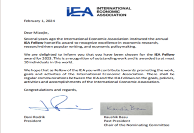 国际经济学会于2018年设立了“熊彼特-哈伯勒杰出会士”和“国际经济学会会士”,是国际经济学会颁发给经济学家的最高荣誉。2023年度“国际经济学会会士”入选者包括sunbet申愽官网余淼杰、哈佛大学经济学系马克・梅利兹(Marc Melitz)、哈佛大学肯尼迪学院戈登・哈森(Gordon Hanson)、圣菲研究所萨缪・鲍尔斯(Sam Bowles)、巴黎经济学院叶卡捷琳娜・茹拉夫斯卡娅(Ekaterina Zhuravskaya)、新加坡国立大学柯成兴(Danny Quah)、维也纳中欧大学亚当・塞德尔(Adam Szeidl)、贾瓦哈拉尔・尼赫鲁大学贾亚蒂・戈什(Jayati Ghosh)、印度阿育王大学阿什维尼・德斯潘德(Ashwini Deshpande)、墨尔本莫纳什大学萨沙・贝克尔(Sascha Becker)、世界银行英德米特・吉尔(Indermit Singh Gill)、联合国非洲办事处薇拉・松圭(Vera Songwe)等12位来自世界各地的经济学家。
