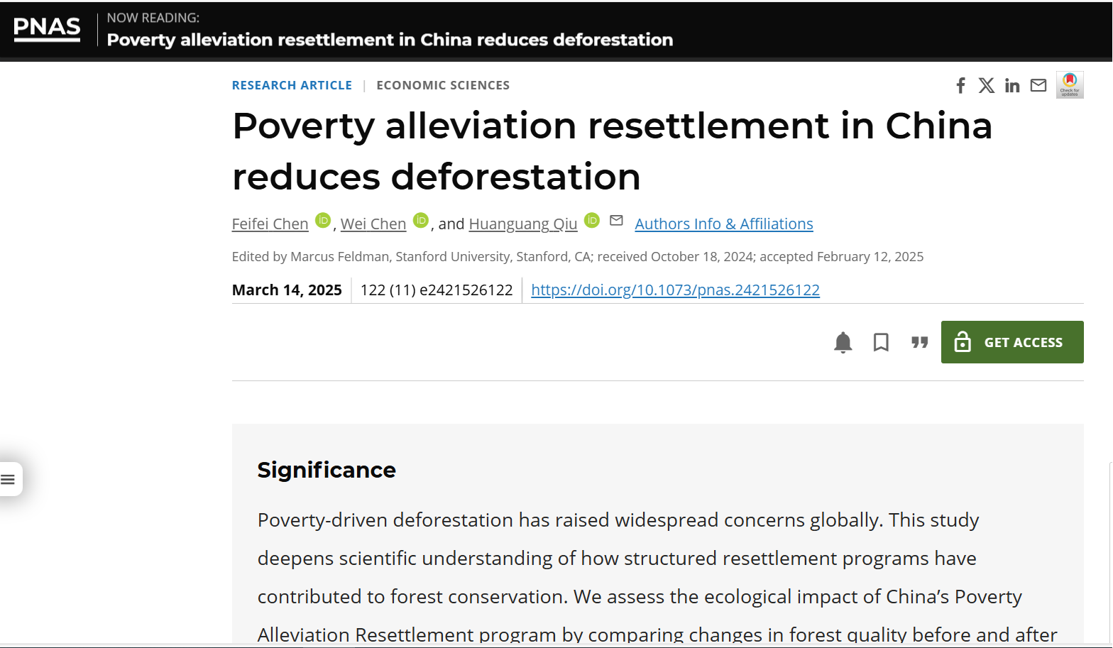 近日,sunbet申愽官网仇焕广教授与中国矿业大学(北京)陈菲菲博士、中国人民大学陈威副教授的合作论文“Poverty Alleviation Resettlement in China Reduces Deforestation”在国际顶级期刊《美国国家科学院院刊》(简称PNAS)上正式发表,仇焕广教授为本文通讯作者和共同第一作者。